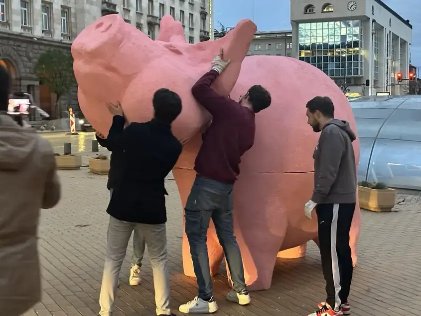 Пред сградата на Народното събрание тази сутрин от „Продължаваме промяната“ поставиха необичайна “арт инсталация” – огромно розово прасе-касичка. От партията определиха инсталацията като „символ“, а Асен Василев обясни, че тя е предупреждение за това, което представлява проектобюджетът за 2026 г – “една голяма касичка за властта, която всеки от нас ще напълни с по 600 лв.”