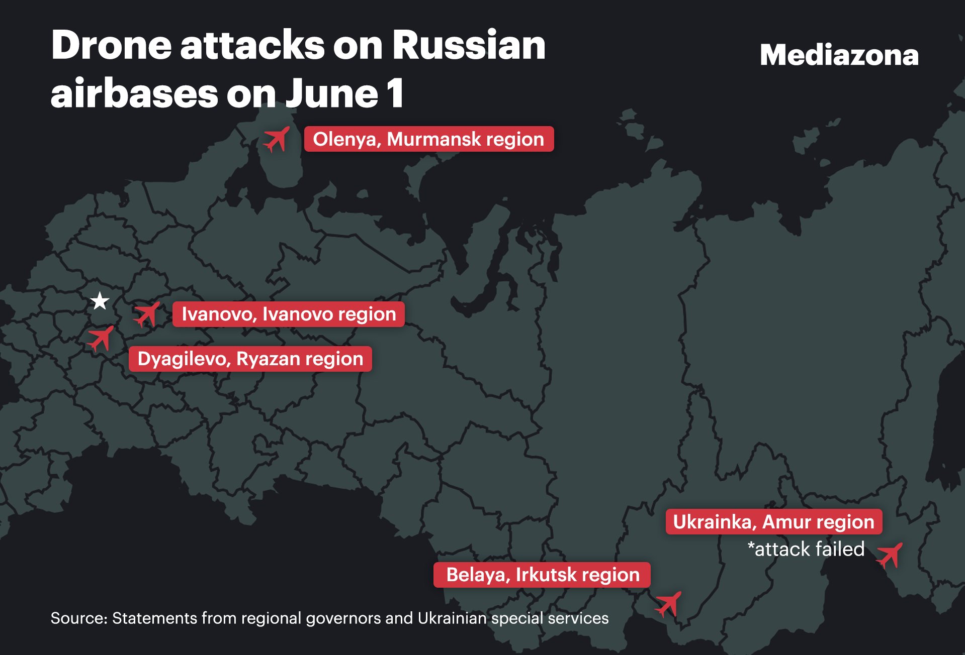 Руското Министерство на отбраната призна за масивната украинска атака срещу бази на ВВС на руска територия на 1 юни – включително срещу много отдалечени зони като Мурманск и Иркутск (Сибир).